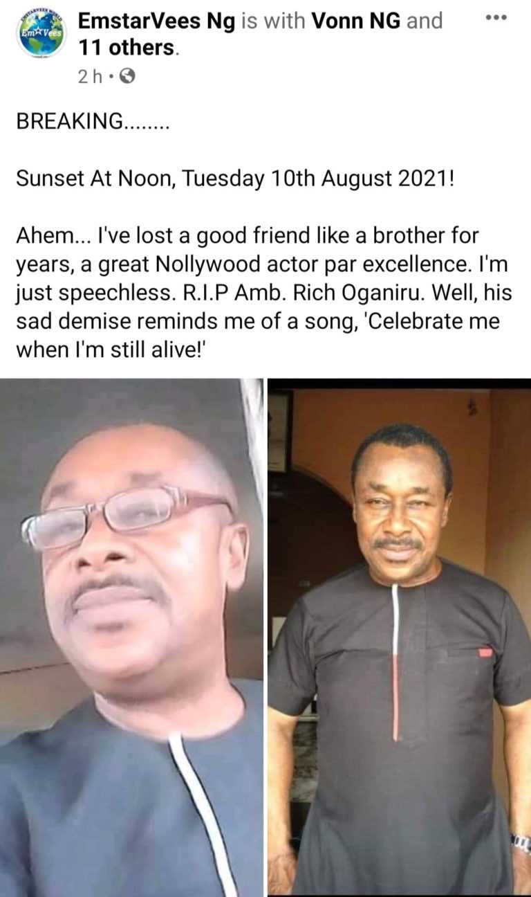 Another tragedy has struck in the nigerian movie industry as veteran actor rich oganiru passes on.